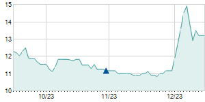 | 12/17/2010 | +0.50 / +4.59% | 11.40 | 11.40 | 11.30 | 11.40 | 11.40 | 10.34 | 149,300 |   |
