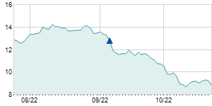| 4/12/2022 | -0.32 / -3.70% | 8.68 | 8.90 | 8.33 | 8.33 | 8.63 | 8.33 | 2,815,400 |   |