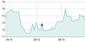 | 9/4/2014 | +1.10 / +9.24% | 12.10 | 13.00 | 12.10 | 13.00 | 13.00 | 13.00 | 383,500 |   |