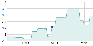 | 1/19/2011 | +3.10 / +6.33% | 48.00 | 52.10 | 47.50 | 52.10 | 50.02 | 3.30 | 90,500 |   |