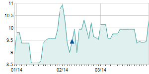 | 4/10/2013 | +0.90 / +9.78% | 9.20 | 10.10 | 9.20 | 10.10 | 10.10 | 1.36 | 3,800 |   |